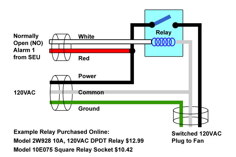 Wiring Diagram for Alarm 1 to control 120VAC, 10A exhaust fan.
