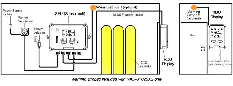 The RDU (Remote Display Unit) should be placed outside the CO2 storage room during use. The RDU is connected to the SEU with a CAT5 cable. An 8 meter (26 ft.) cable is supplied, although up to 3 daisy-chained RDUs over 75 meters (250 ft.) using CAT5 cable has been tested. The RDU should be placed where it can be conveniently observed before entering the room where the SEU is located. The RDU is a repeater, and displays the measurements made by the SEU on an easy-to-read digital LCD along with important safety information.
